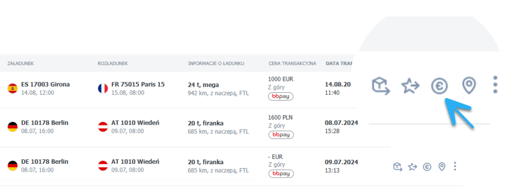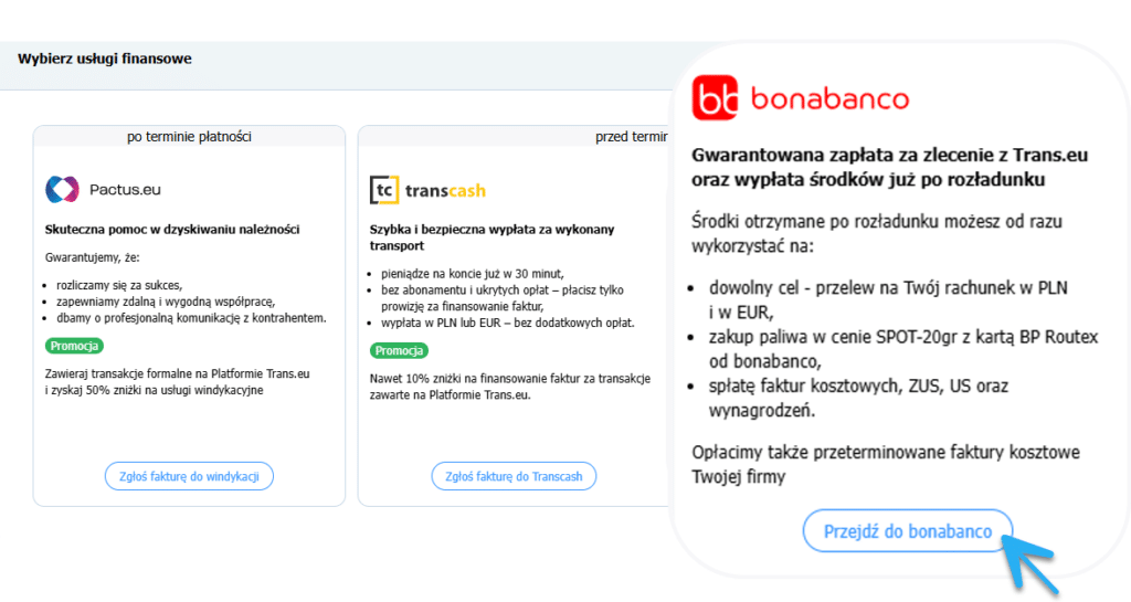 • ułatwione przejście do Panelu Klienta bonabanco z poziomu wyboru usług finansowych na Platformie Trans.eu — wystarczy, że przejdziesz na zakładkę “Szukaj ładunków”–>”Zaakceptowane” i klikniesz na liście ikonę “€” a następnie “Przejdź do bonabanco”